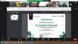 Acara diakhiri dengan pemberian sertifikat oleh Gita Gayatri, Ph.D. dan foto bersama-sama secara vitual.