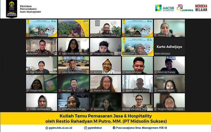 Pada Hari Kamis, 12 Oktober 2023 pada pukul 18.30-21.00 WIB Program Pascasarjana Ilmu Manajemen (PPIM) mengadakan kuliah tamu dari Restio Rahadyan Megawiranto Putro, MM yang merupakan General Manager PT. Midsolin Sukses. Kuliah tamu untuk perkuliahan kelas Pemasaran Jasa & Hospitality (mahasiswa S2 Digital Marketing and Analytics Angkatan 2023 kelas Reguler dan Khusus). Acara kuliah tamu...Read More