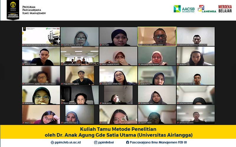 Pada Hari Jumat, 6 Oktober 2023 pada pukul 09.00-11.30 WIB Program Pascasarjana Ilmu Manajemen (PPIM) mengadakan kuliah tamu dari Dr. Anak Agung Gde Satia Utama, SE., M.Ak., Ak., CA.,CIQAR., Cert.DA yang merupakan Lektor Departemen Akutansi, Fakultas Ekonomi dan Bisnis Universitas Airlangga. Kuliah tamu untuk perkuliahan kelas Metode Penelitian dalam Manajemen (mahasiswa S2 Digital Marketing and...Read More