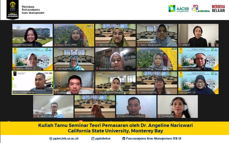 Pada Hari Selasa, 7 November 2023 pada pukul 09.00-11.30 WIB Program Pascasarjana Ilmu Manajemen (PPIM) mengadakan kuliah tamu dari Dr. Angeline Nariswari yang merupakan Associate Professor of Marketing and Social Entreprenuership, California State University, Monterey Bay. Kuliah tamu untuk perkuliahan kelas Seminar Teori Pemasaran (mahasiswa S3 Pemasaran). Acara kuliah tamu terselenggara berkat Dosen yang mengajar...Read More